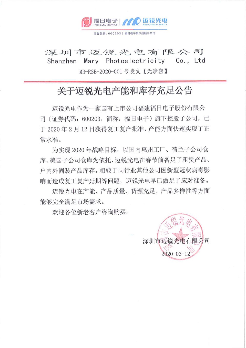 因新型冠狀病毒影響而造成了復(fù)產(chǎn)延期等問題,邁銳光電早已做足了應(yīng)對(duì)準(zhǔn)備。公司在惠州有大型研發(fā)基地,標(biāo)準(zhǔn)化生產(chǎn)管理,高效的生產(chǎn)力,擁有完美的LED生產(chǎn)生態(tài)鏈,在產(chǎn)能質(zhì)量和產(chǎn)品多樣性等方面完全滿足市場(chǎng)需求。