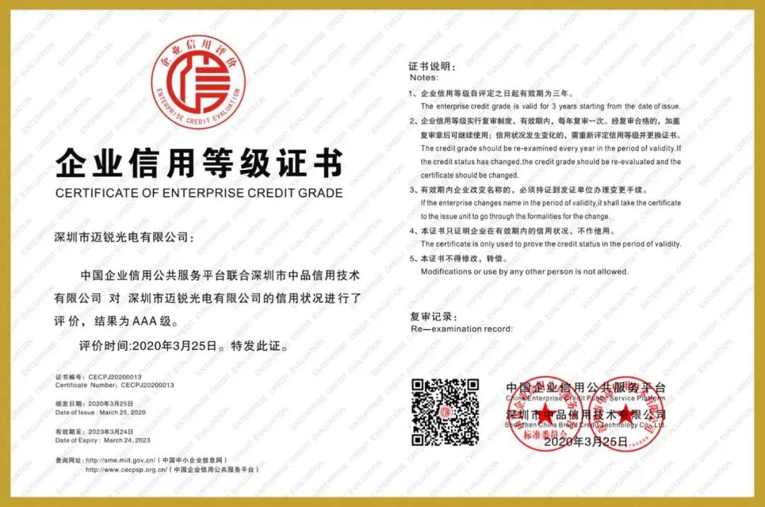 近日,通過中國企業(yè)信用公共服務(wù)平臺(tái)和深圳市中品信用技術(shù)有限公司的評(píng)估,邁銳光電二次獲得AAA級(jí)信用企業(yè)證書-信用程度高,合同履約能力強(qiáng),具有優(yōu)秀的信用紀(jì)錄,經(jīng)營狀況佳,盈利能力強(qiáng),發(fā)展前景廣闊。
