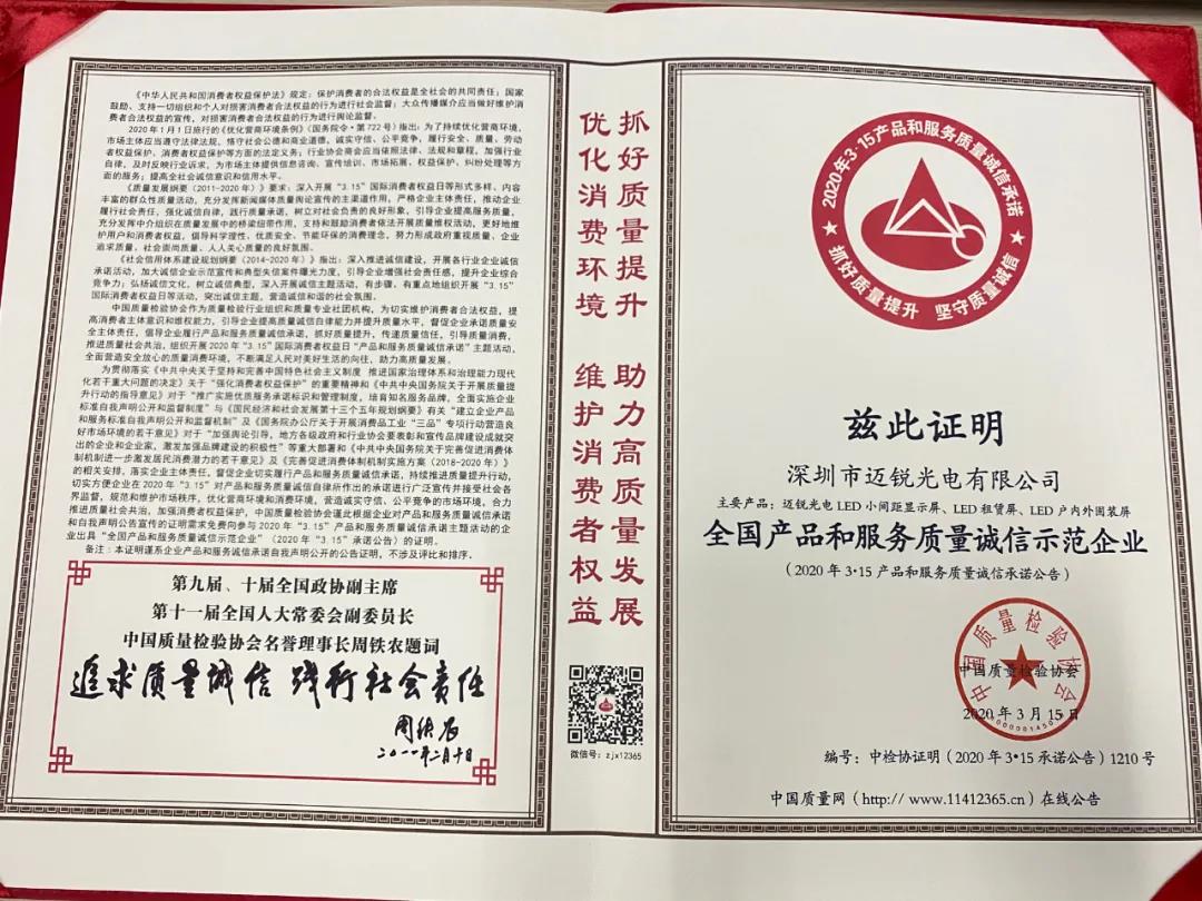 邁銳光電繼榮獲“建筑業(yè)企業(yè)資質(zhì)”證書后,再次斬獲中國質(zhì)量檢驗(yàn)協(xié)會(huì)頒發(fā)的“全國產(chǎn)品和服務(wù)質(zhì)量誠信示范企業(yè)”“全國LED顯示屏行業(yè)質(zhì)量領(lǐng)先企業(yè)”證明。