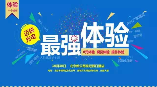 10月30日,以“十年載譽·新品呈鑒”為主題的邁銳光電十城感恩巡展暨新品推介會將在北京新云南皇冠假日酒店隆重舉行。屆時,邁銳光電將聯袂國星光電、日月成科技、諾瓦電子、視誠科技四大戰略伙伴,邀請各大客戶、渠道商、集成商、媒體朋友、行業同仁共聚一堂,為大家奉上本年度市場與技術方面最前沿、最實用的LED視聽盛宴。