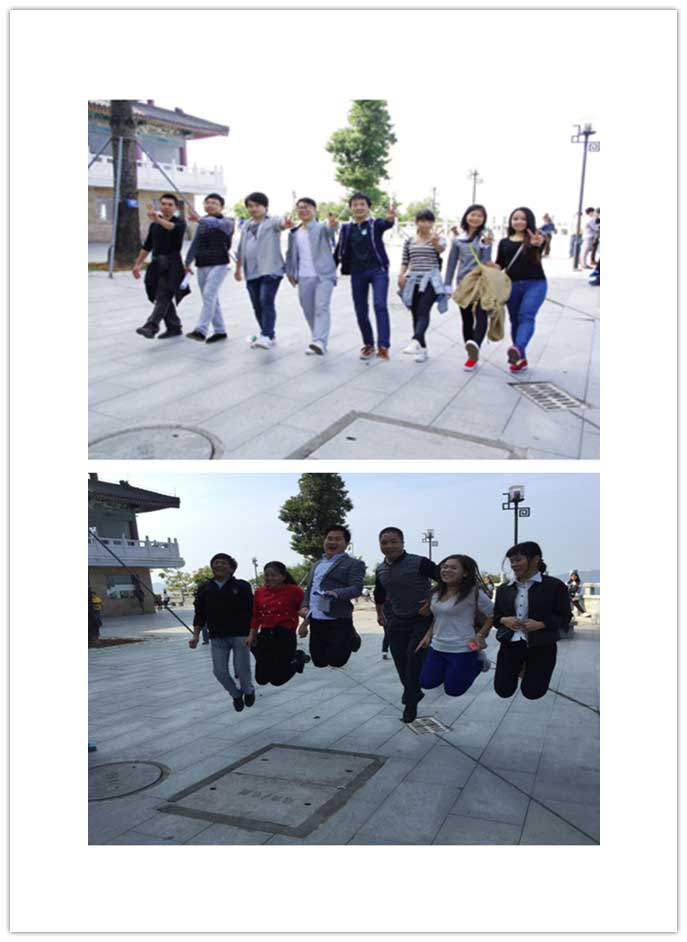 這一次爬山活動我們一改往常比快獲獎的形式,改為最晚到達的小組將獲得節目表演的機會。短暫休息之后,最晚達到的小組為大家邊唱邊跳的表演了《兩只老虎》。期間以小組為單位的進行了豐富多彩的活動活動:如小組人員合唱,以登山為主題的或帶有山字的歌曲2首;尋找2名年齡5-10歲的小朋友,小組成員為他們唱2首兒童歌曲,直到小朋友點贊為止;任選隊里一男一女10分鐘到達掛榜閣6樓,并合唱《你是風兒,我是沙》;1分鐘內,尋找一名長發女性路人大聲說我愛你,然后奔跑回原點;小組成員完成:全員腳離地,眼睛張開并露出牙齒的合照等小組活動,活動還設置了多項獎勵,高漲的情緒一直縈繞,愉悅的笑容掛在每個人的臉上。全體員工合影后,陸陸續續的踏上了回家的征程,本次活動圓滿結束。