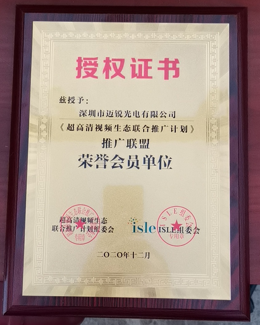 為了加快超高清產(chǎn)業(yè)發(fā)展和應(yīng)用普及,進一步發(fā)揮項目平臺作用超高清視頻生態(tài)聯(lián)合推廣組委會同步與邁銳等14家企業(yè)組成戰(zhàn)略推廣聯(lián)盟,由組委會為首批會員企業(yè)授予榮譽會員單位資格證書。