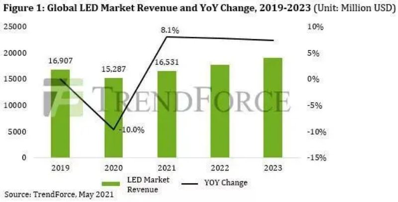 據集邦咨詢(TrendForce)全球 LED 市場調查報告數據顯示:預計 2021 年全球 LED 市場收入將達到 163.5 億美元,相比去年增長 8.1%,其中有一項增長就來自于戶外LED顯示屏。由此可見,戶外LED顯示屏的市場需求依然可觀。